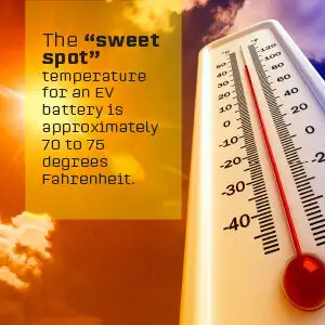 The “sweet spot” temperature for an EV battery is approximately 70 to 75 degrees Fahrenheit. In normal operations, EVs are wired to fluidly maintain temps. In colder weather, the vehicle’s heating system kicks in, heating water which, in turn, flows to warm the battery. Likewise, in hot weather, the vehicle’s AC compressor cools water via a component called the “chiller,” helping to keep the battery temperature lower.