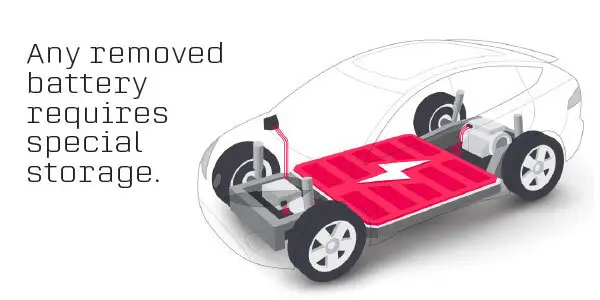 Full battery replacement can require shipping to a recycling facility; some manufacturers have their own (e.g. Volkswagen/Audi in Germany). Other OEMs require sending the old battery to the dealership, and some provide their own fire-protective recycling containers for shipping — classified as high-risk shipping “Class 1.”